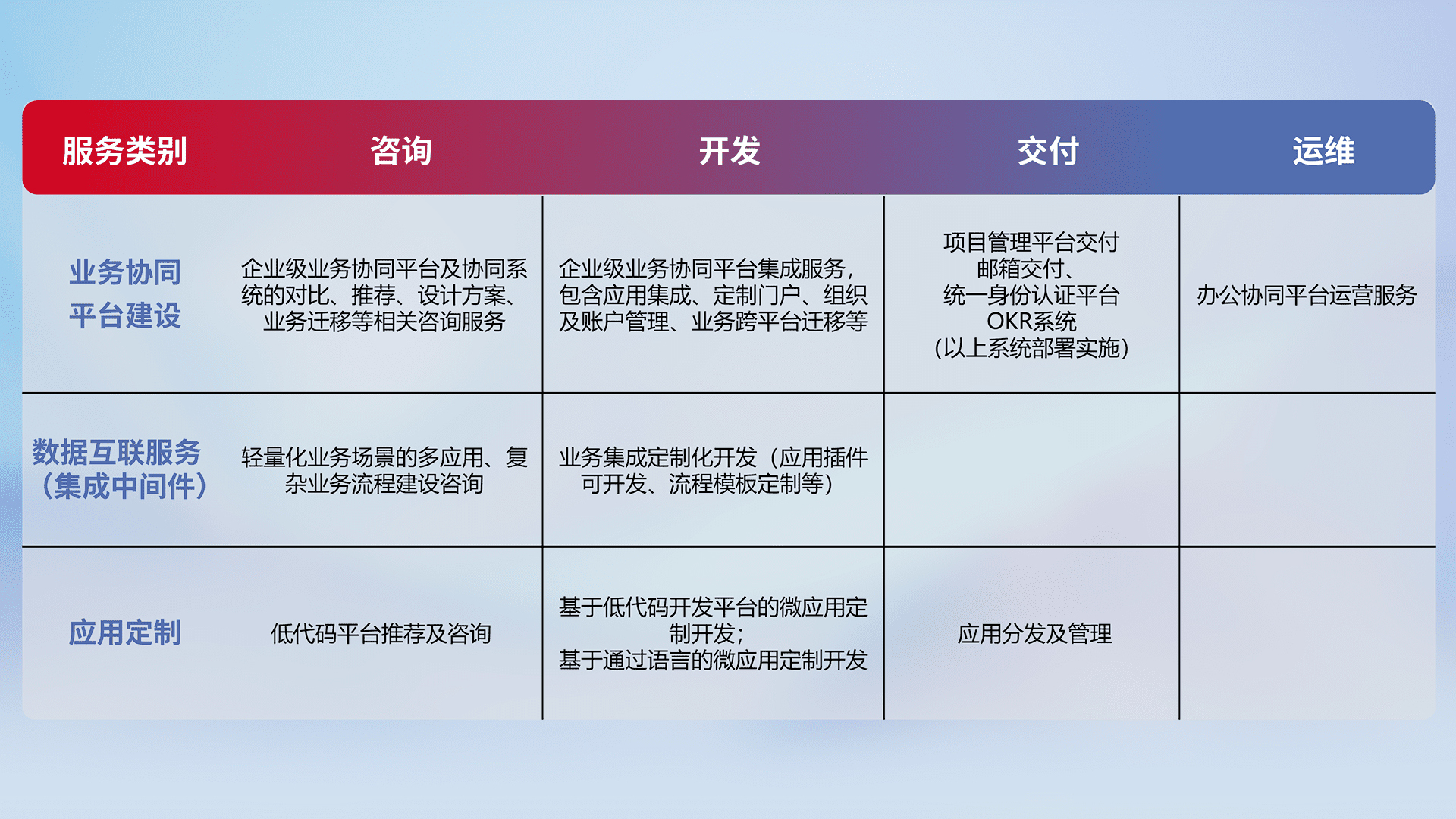 针对钉钉、、企微、、、、IDaas等平台级产品提供产品的规划、、方案、、交付、、、、定制化开发等服务,,,,实现如统一协同办公、、智能客户服务、、、、混合会议管理、、、智能数据查询、、、等业务场景,,,实现数字化转型。。。