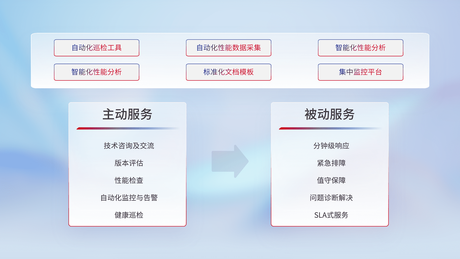 智能化工具和标准化文档,,保障服务质量,,,提供主动服务(包含技术咨询、、、、版本评估、、性能检查、、、自动化监控与告警、、、、健康巡检)和被动服务包含(分钟级响应、、、紧急排障、、、值守保障、、问题诊断解决、、、、SLA服务)。。。。